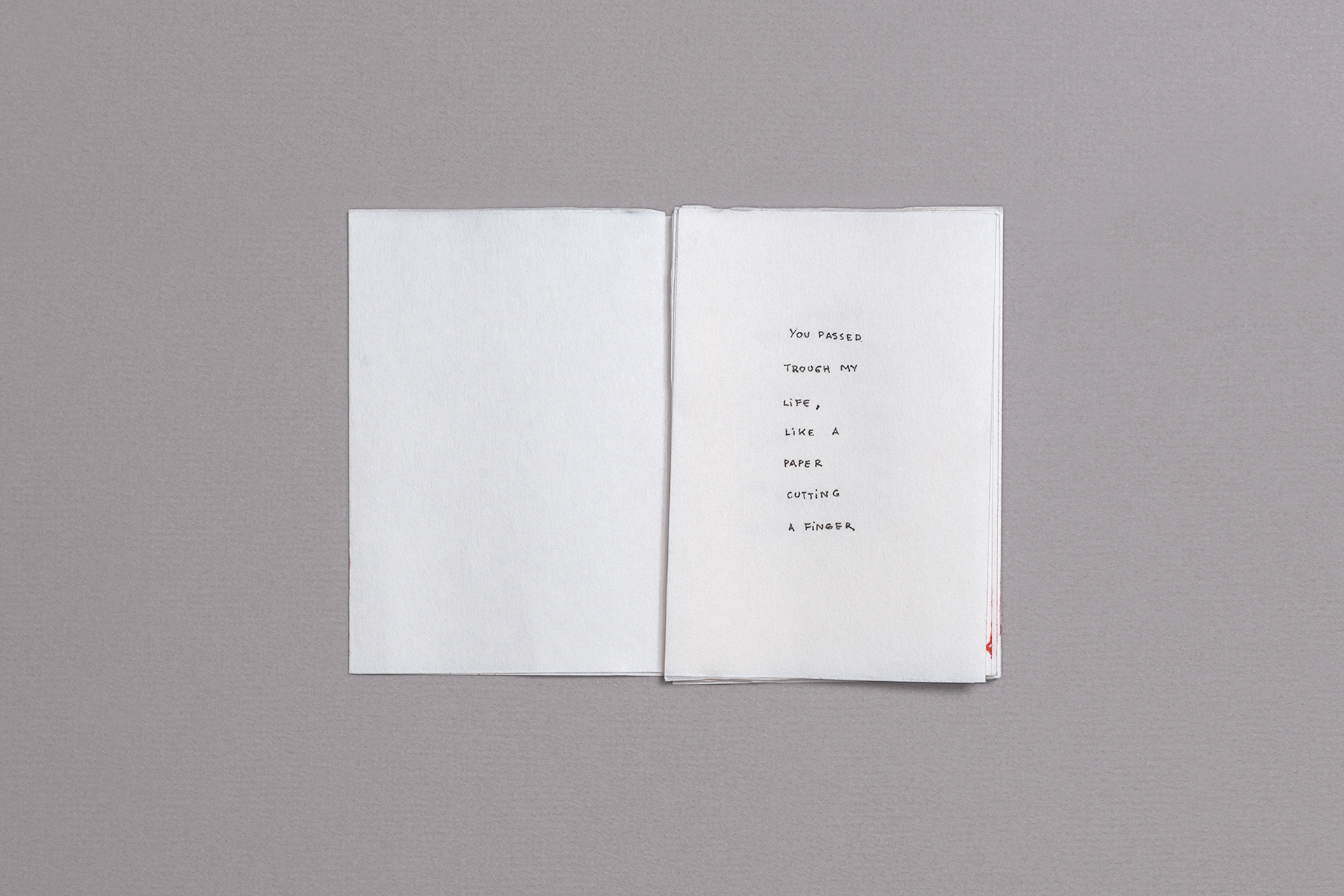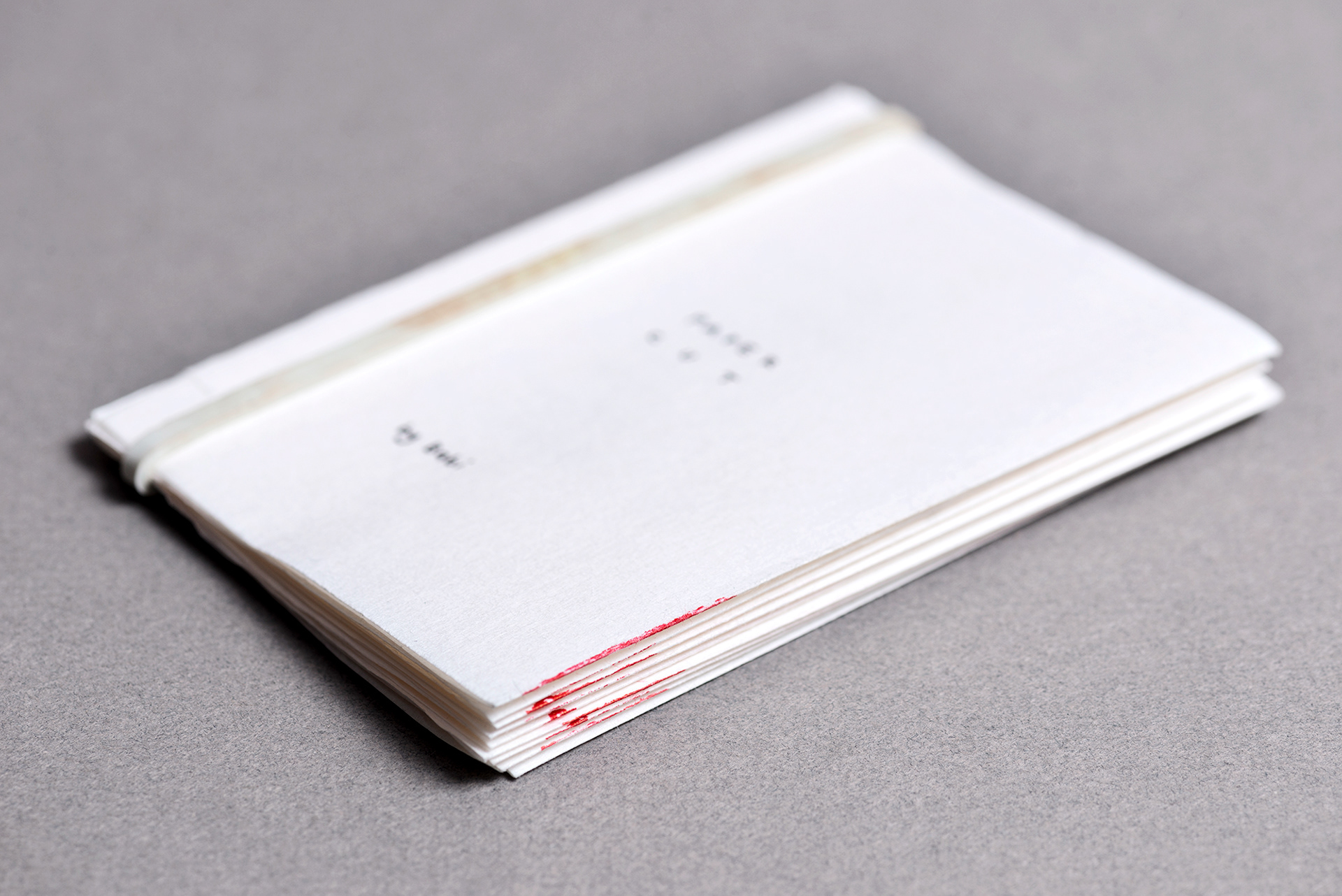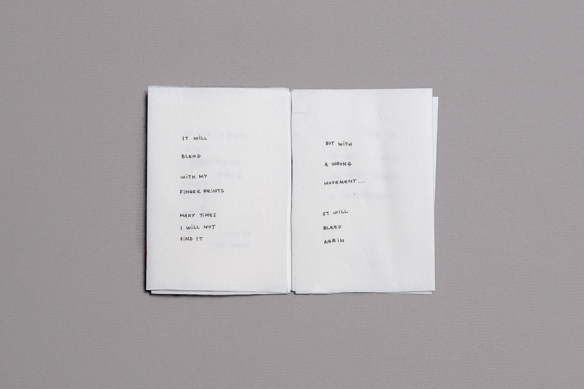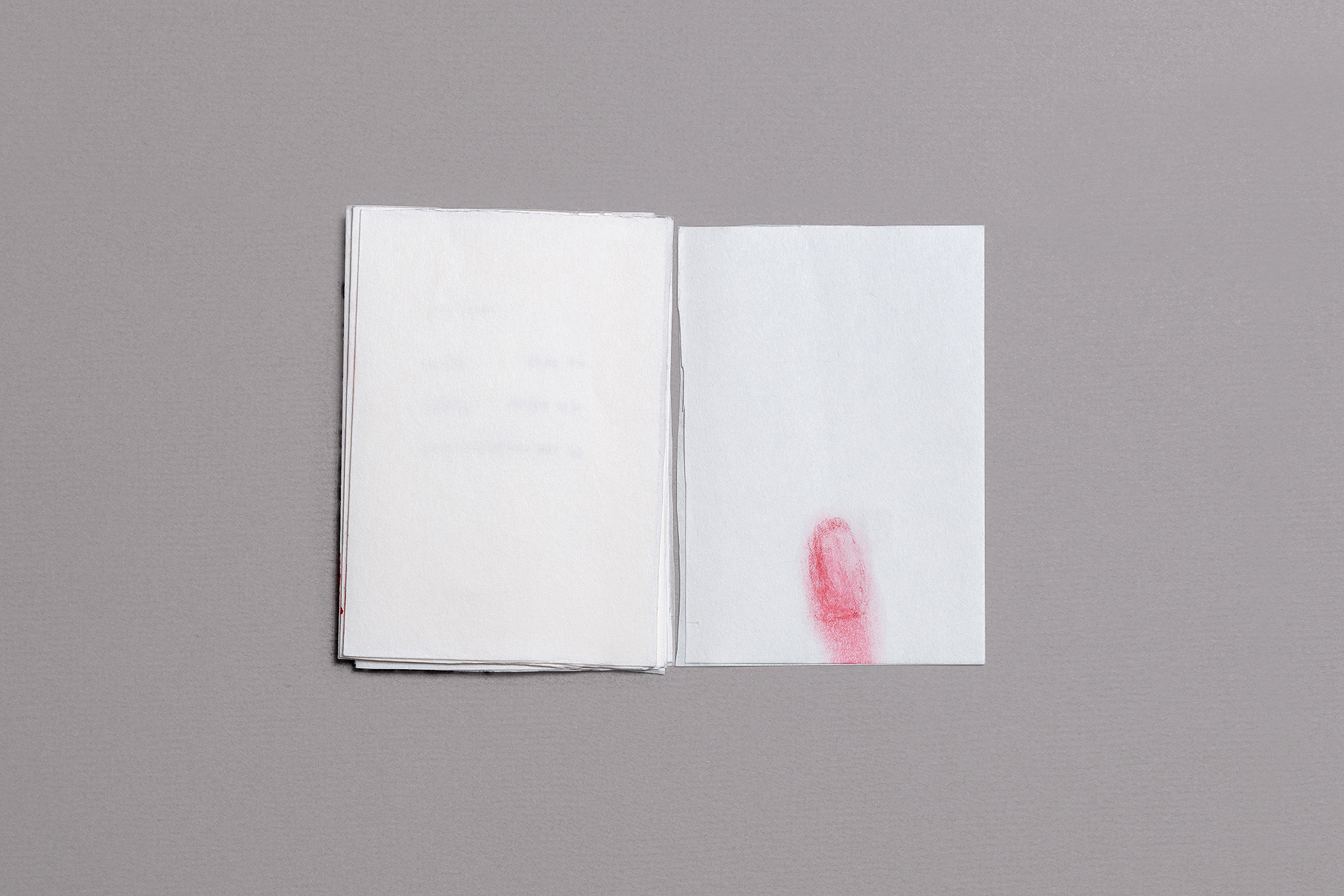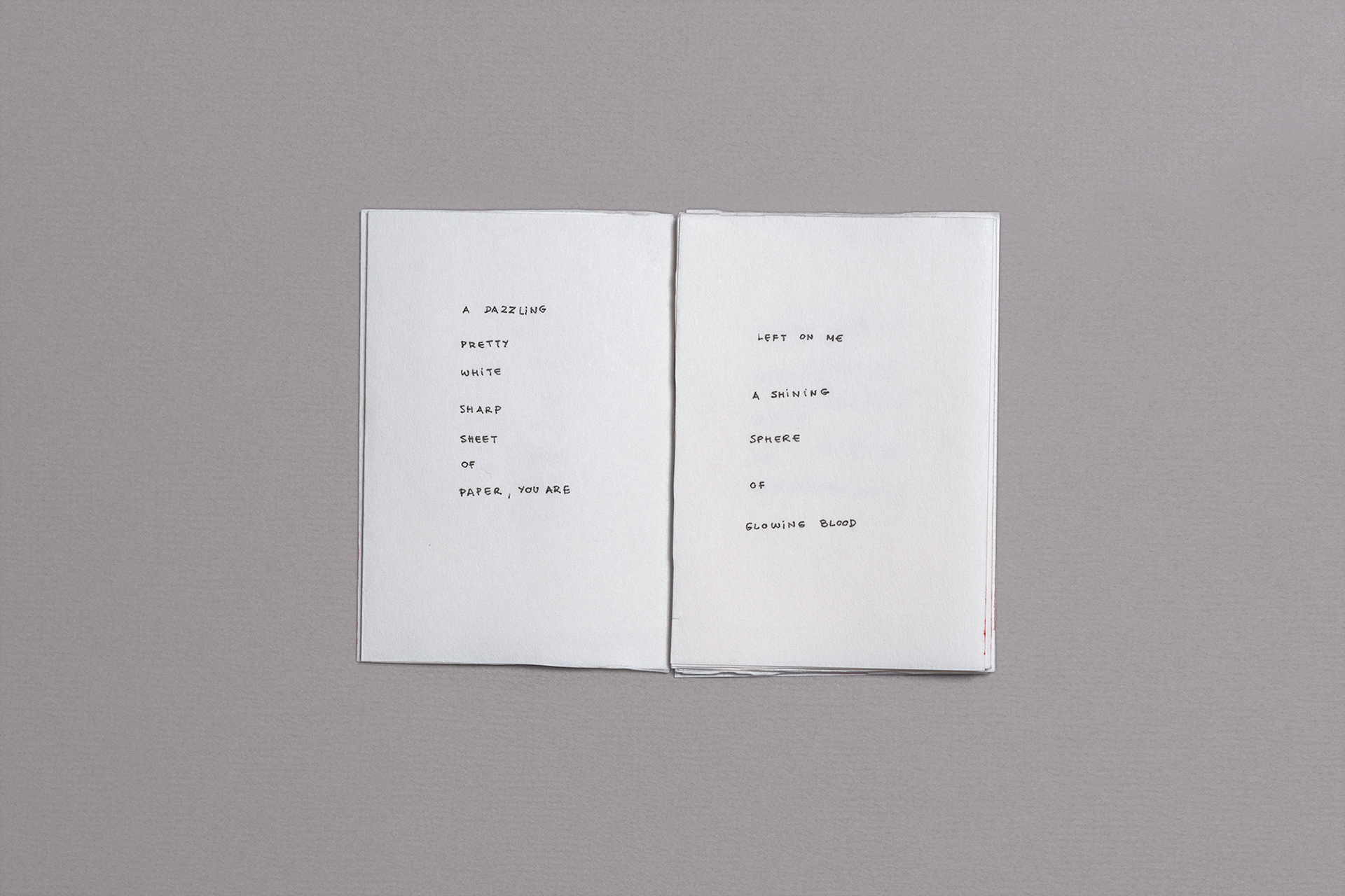 explores the contrast between the white paper and the red ink. The size, 75x100 mm, was intended to fit into the palm of a hand.