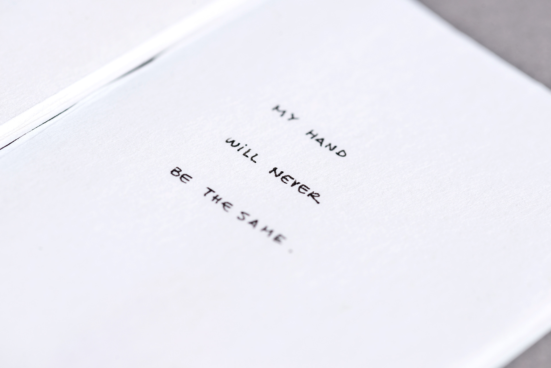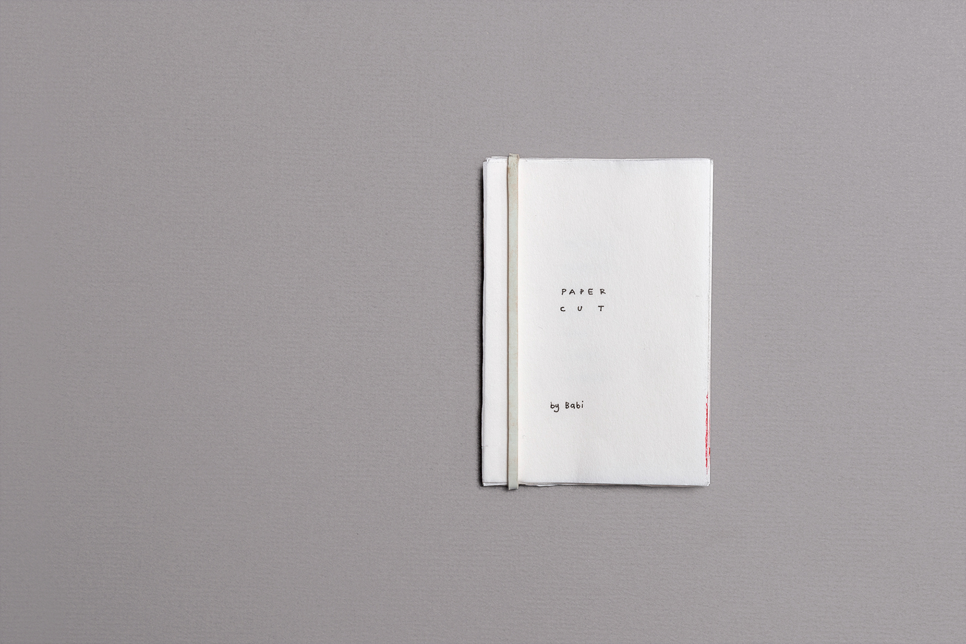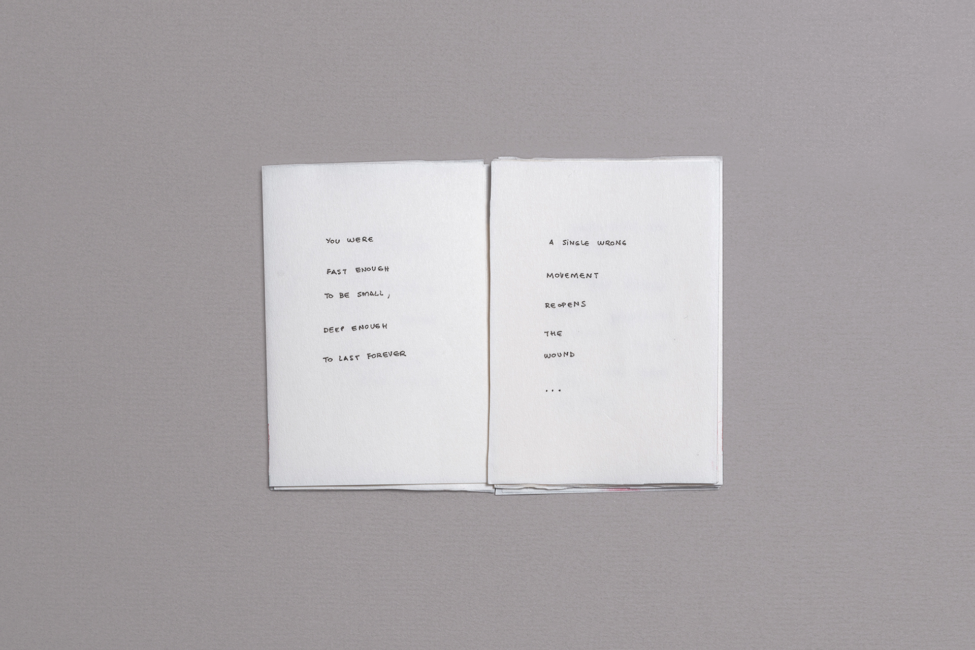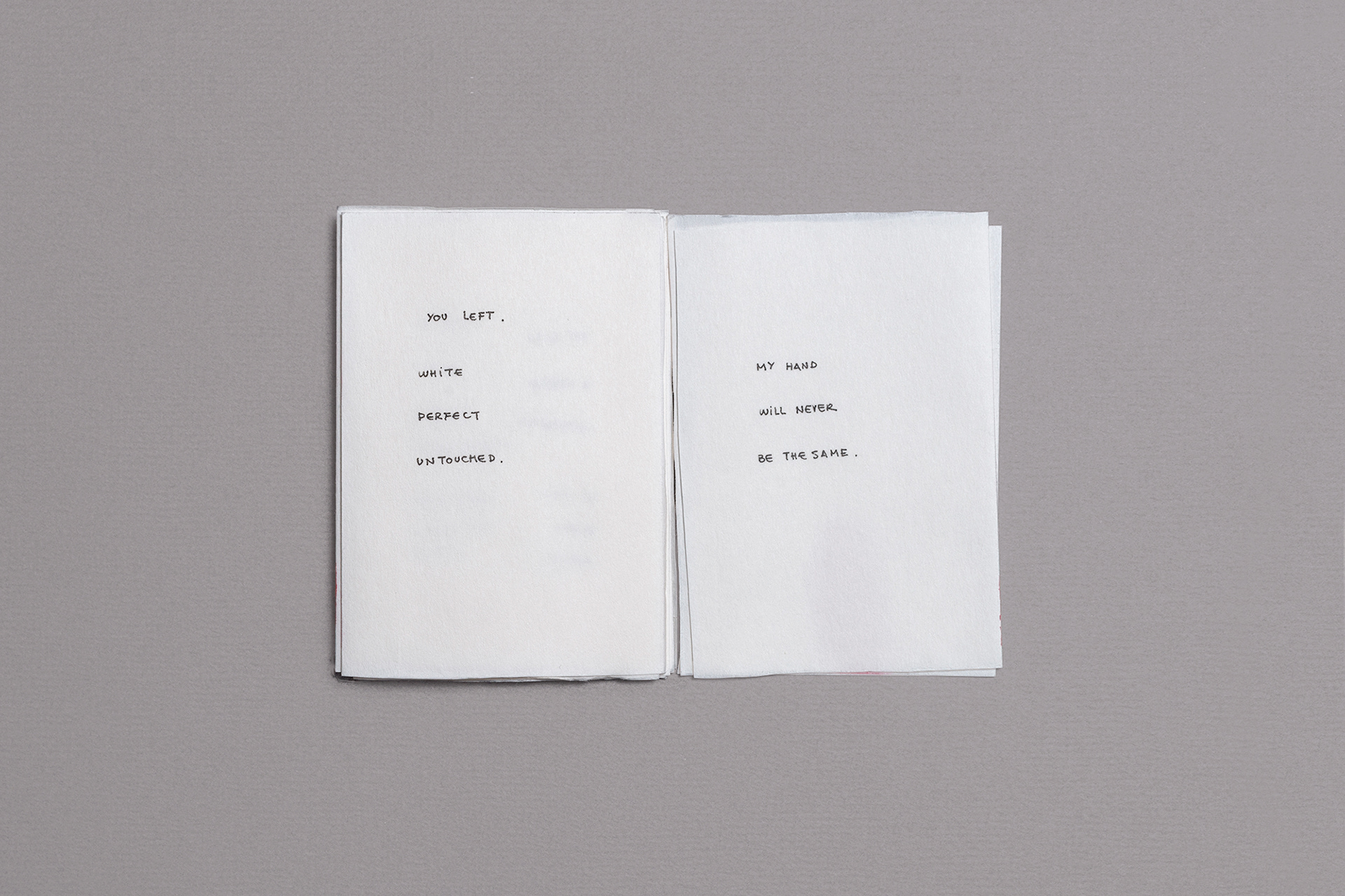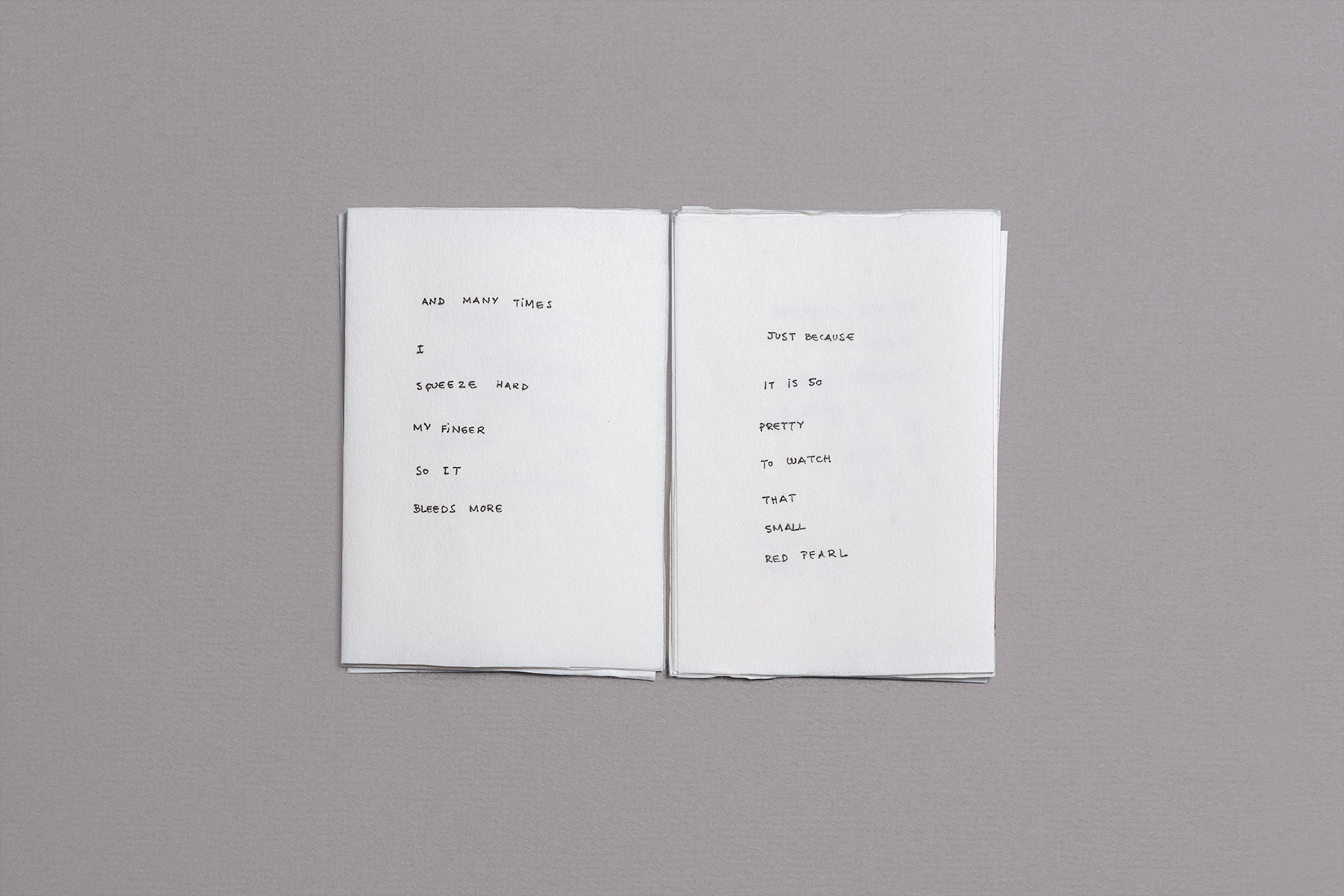explores the contrast between the white paper and the red ink. The size, 75x100 mm, was intended to fit into the palm of a hand.