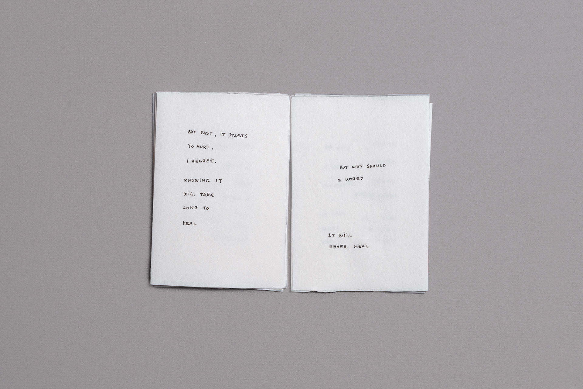 An exploratory narrative, written and bounded by hand.The binding was inspired on ‘fukuro toji’ style, and the text flow